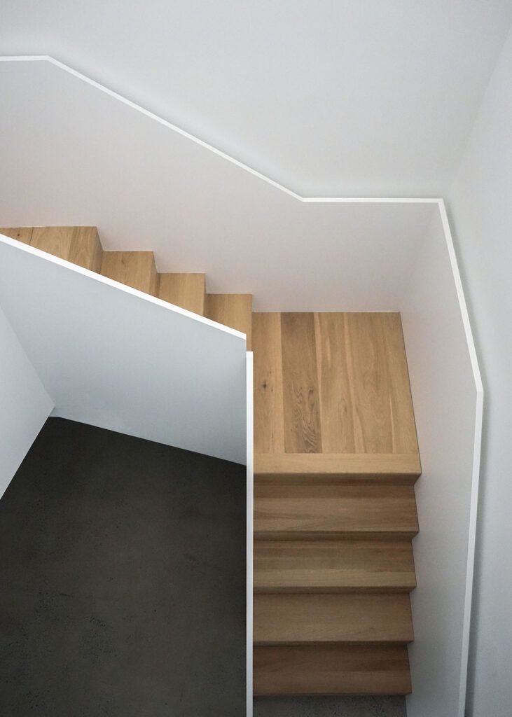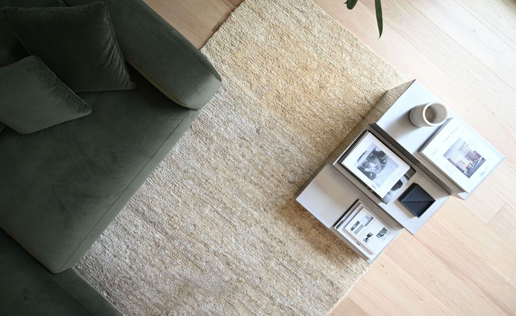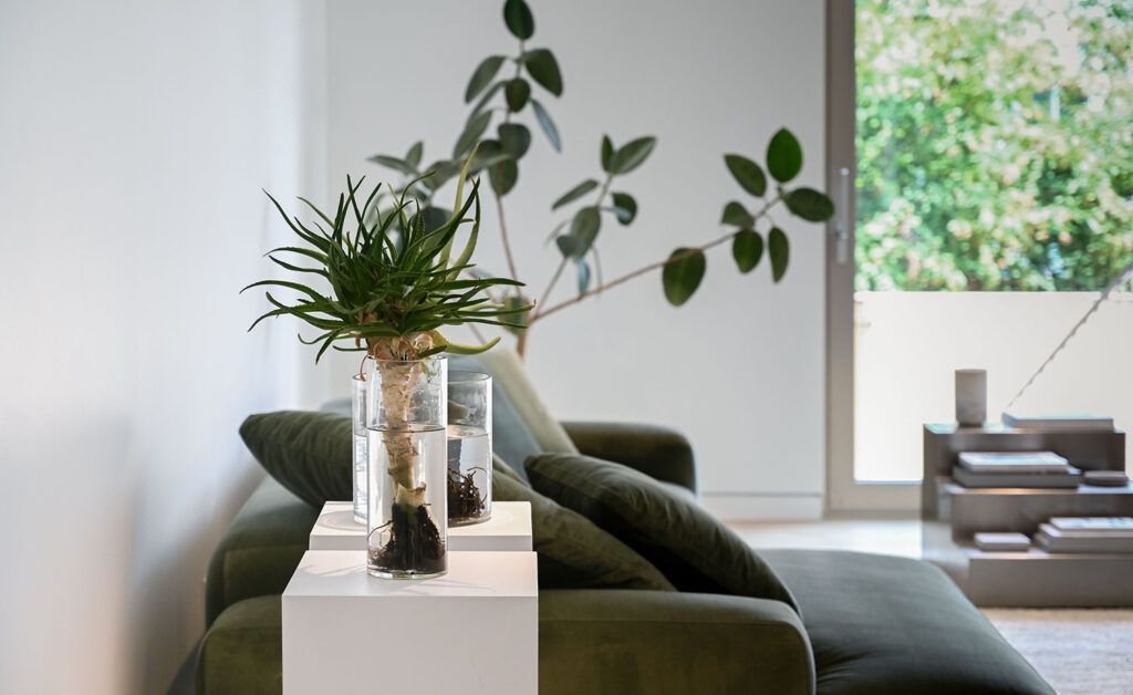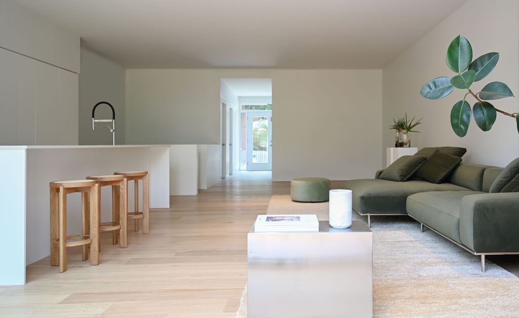 A few edb accessories serve as functional and decorative elements: the Dia24 ottoman in mint velvet and the Elephant stools in oak and cane in the kitchen.