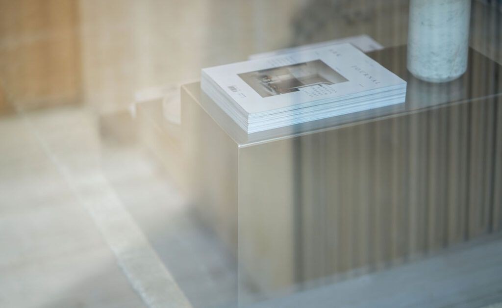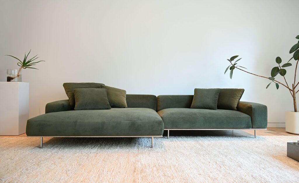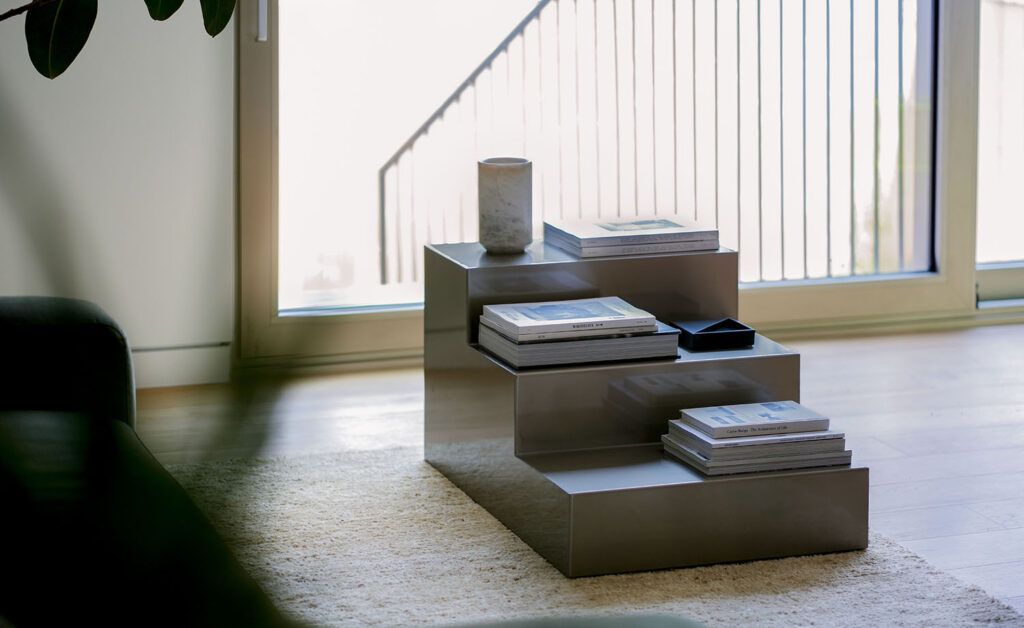In the living room, two new edb products: the Expo Edge sofa in khaki velvet, offering a revisited version of the classic Expo collection. With its low yet elevated profile, it blends effortlessly into the decor. Retaining its puffy shapes and deep seat, this model features a polished steel base, which matches the Inox Steps table, a new addition to the Inox collection.
