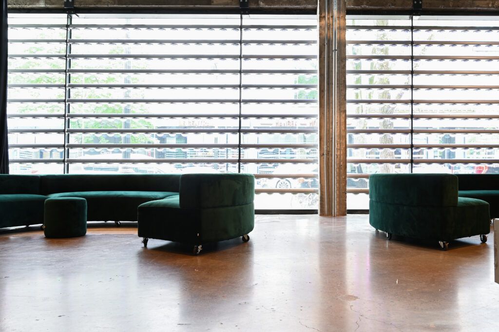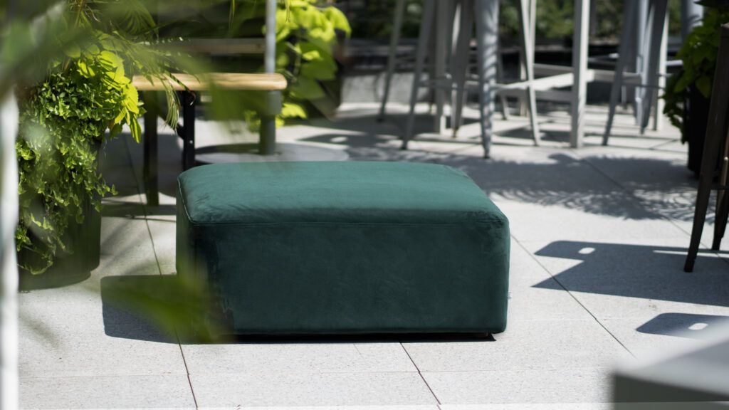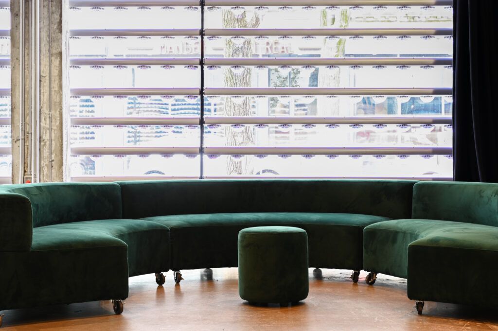 To meet the functional and aesthetic needs of the various spaces, edb’ Panorama Curve modules in emerald velvet were selected. Arranged together, these pieces form large semi-circles: a layout that encourages exchanges between visitors. The customer also opted for casters on these modules to facilitate their reorganization according to the room’s needs. A number of ottomans, including the Cylinder, also serve as practical and decorative accessories.