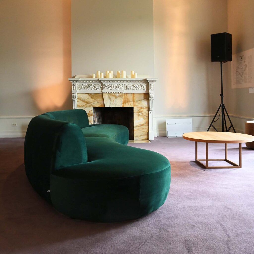In the Founder’s Lounge, the Beluga in emerald velvet, accompanied by the WT oak table and Cylinder ottomans in camel velvet. In the gathering areas, Cascade and Single modules from the Panorama collection, accompanied by Section armchairs in beige Tweed, the natural Pivot table and DIA24 ottomans.