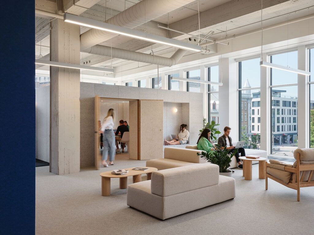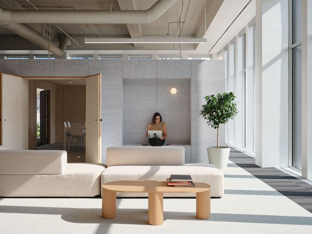 The customizable nature of edb’s products enabled Cossette to match its choice of furniture to the décor with ease: the light grey bouclé slipcovers blend in with the surrounding tones, while the solid oak structures of the Super-Pause chairs echo the natural wood theme present throughout the space.