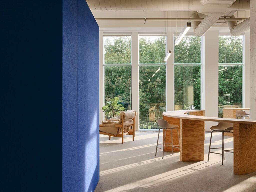 The workspaces take the form of closed cubicles, characterized by a color palette ranging from soft, neutral tones to cobalt blue. The use of natural wood is a recurring element, visible on the interior facades of the cubicles, as well as on the central tables, which serve as a gathering area.