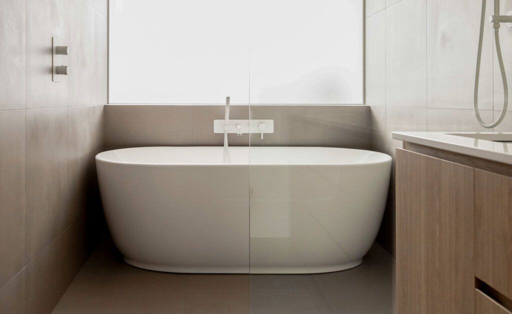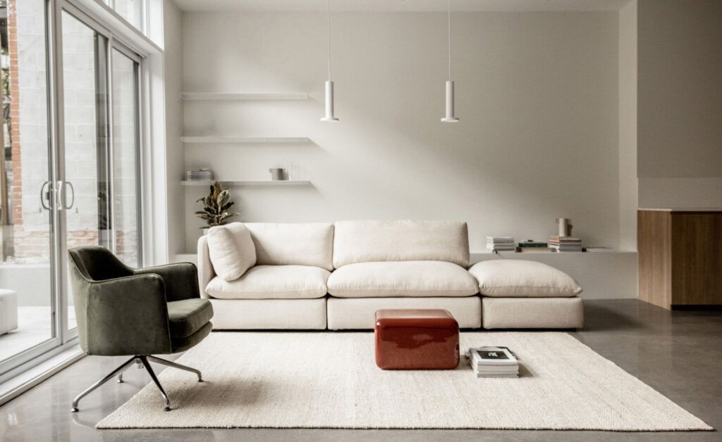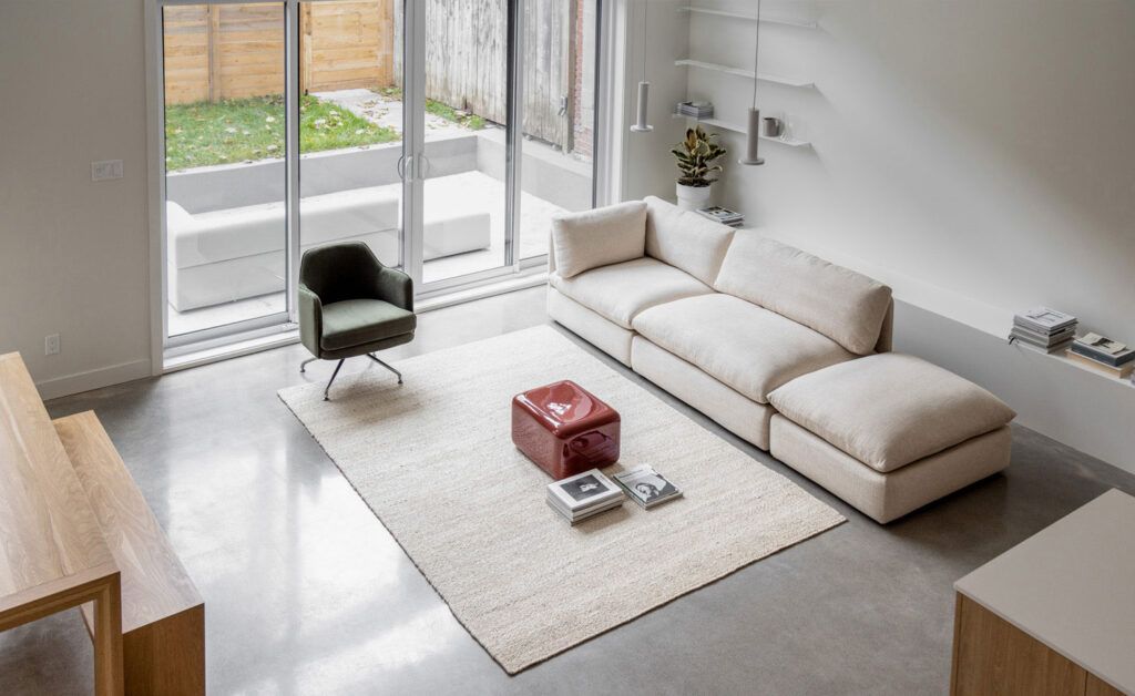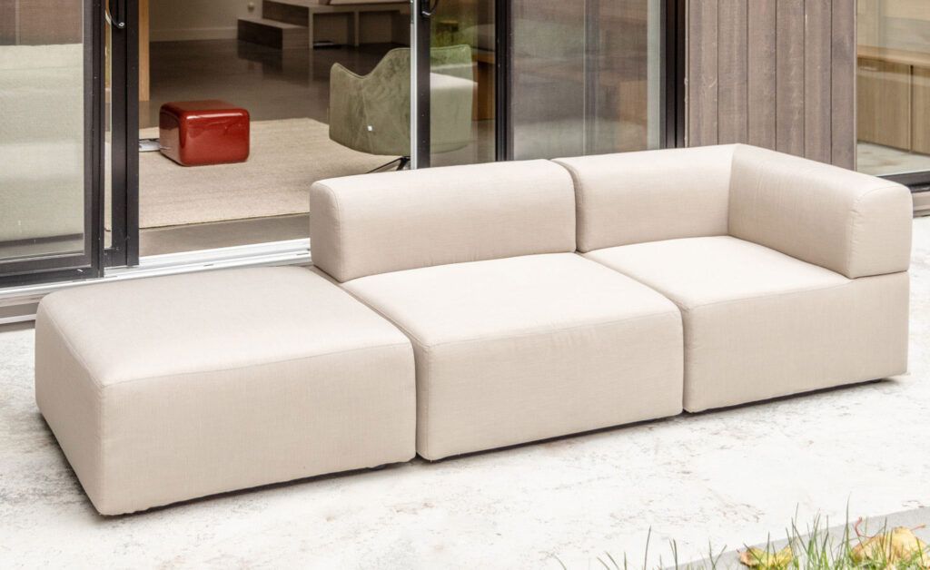 For this light-filled space: new edb furniture to complement the interior design. These include the Puff modular sofa in natural linen, accompanied by the Lobby swivel chair in khaki velvet. The Asteroid side table in deep red fiberglass completes the ensemble.