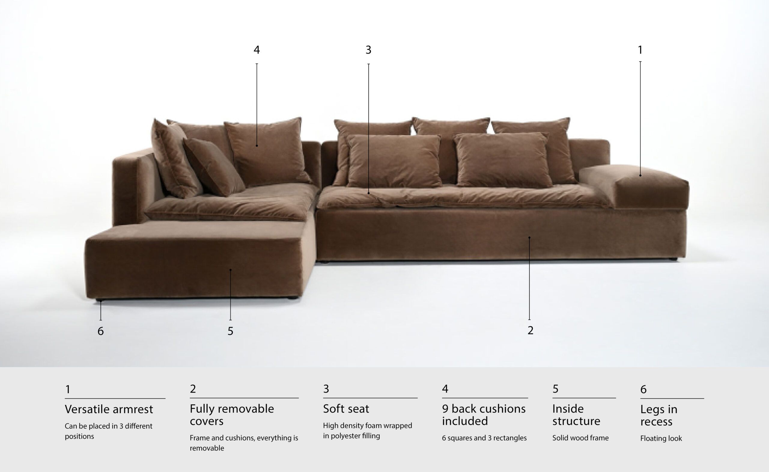 softness as the starting point. a sofa that envelops with plush seats and back cushions. randomly placed, the cushions create the sofa’s identity. a personal disorder for individual spaces. the movable armrest can be placed on the left, in the center or on the right creating new dynamics. a collection designed with freedom of movement in mind. fully removable covers.