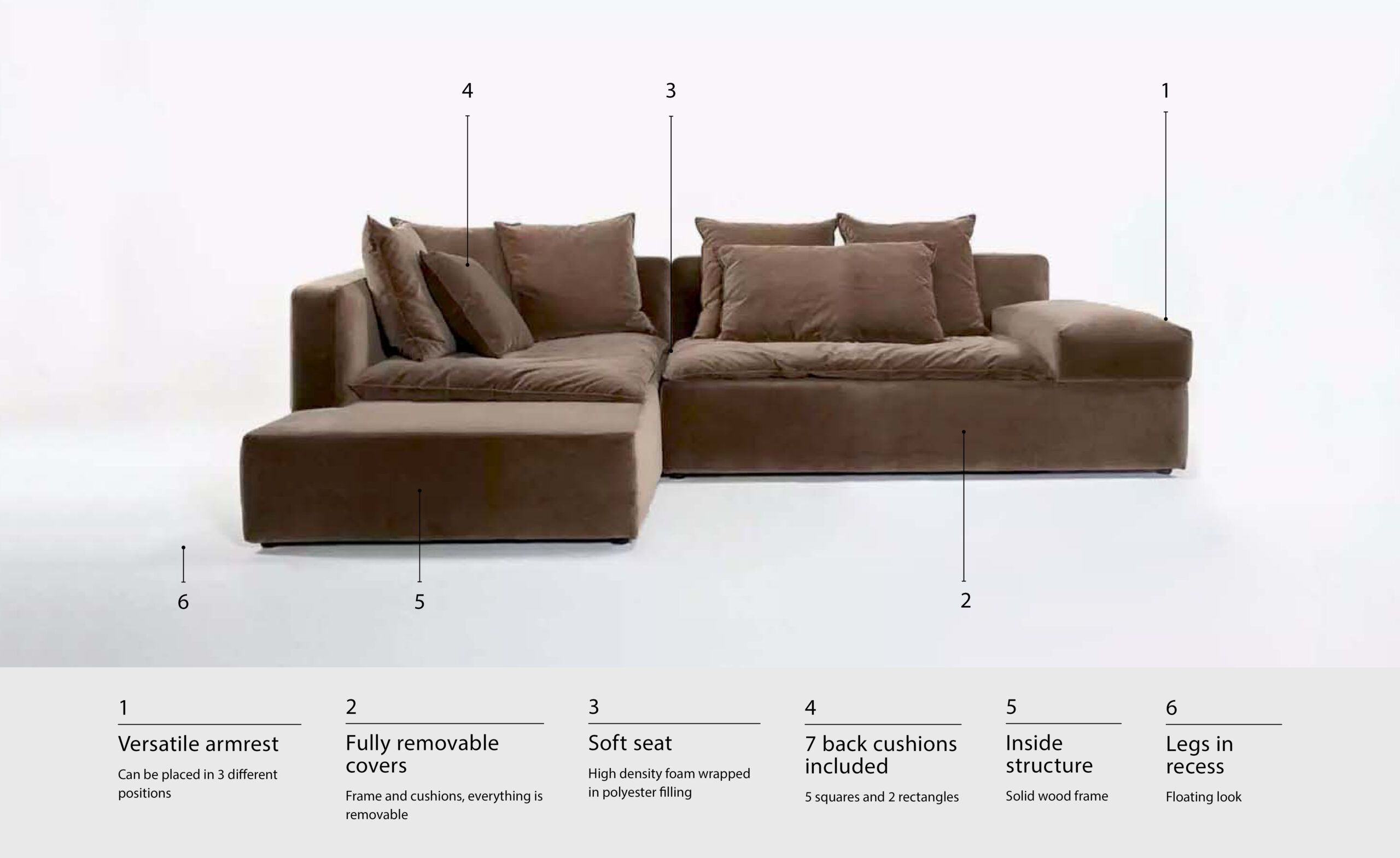 softness as the starting point. a sofa that envelops with plush seats and back cushions. randomly placed, the cushions create the sofa’s identity. a personal disorder for individual spaces. the movable armrest can be placed on the left, in the center or on the right creating new dynamics. a collection designed with freedom of movement in mind. fully removable covers.