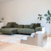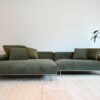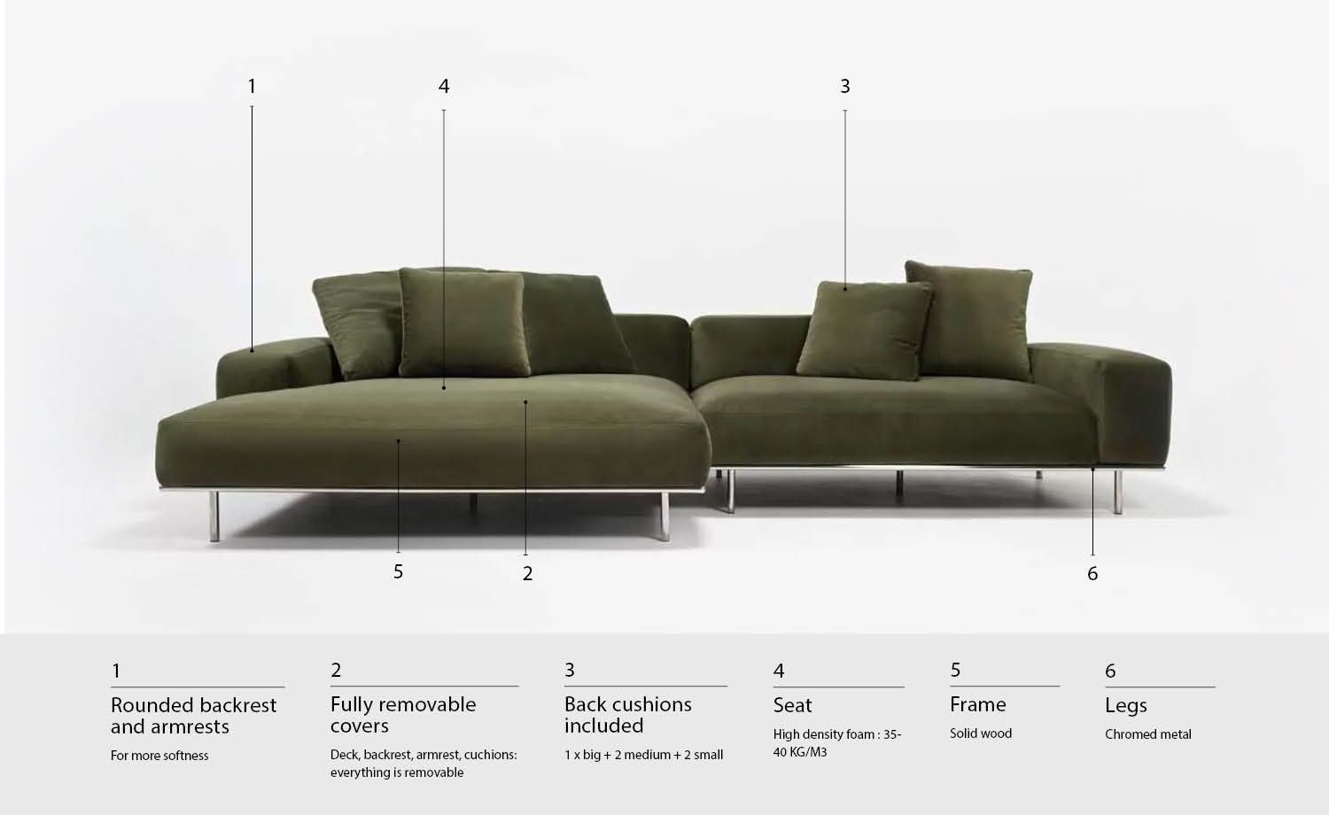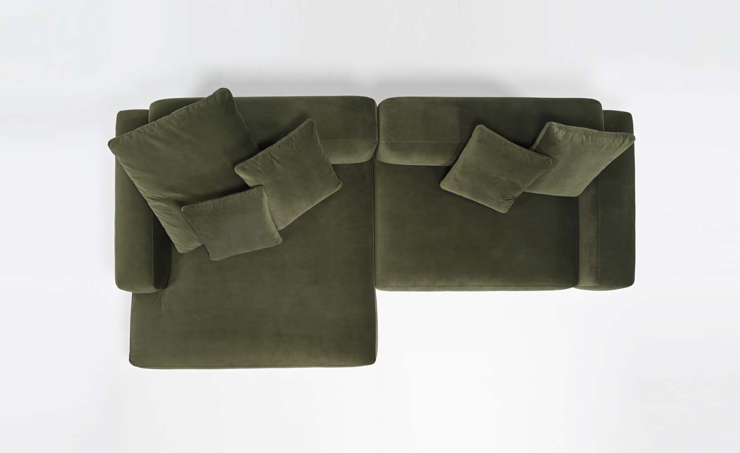 This collection is complemented by a chaise longue with generous volumes and a set of asymmetrically-sized cushions. Designed for those who enjoy unconventional looks and seating positions. Features fully removable slipcovers and is available in all edb fabrics.