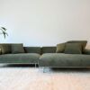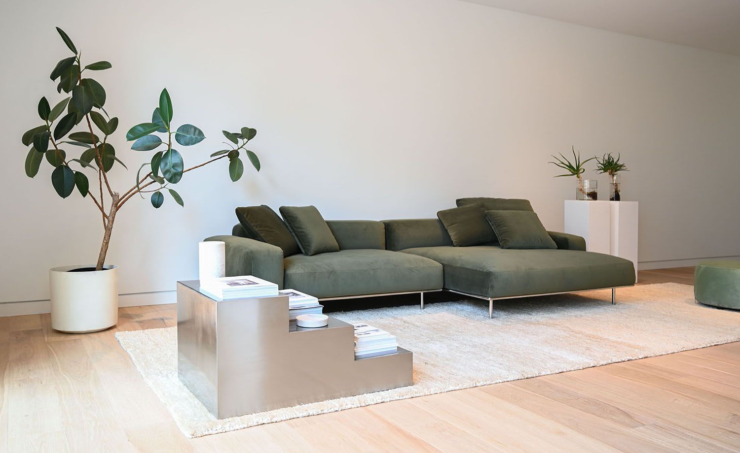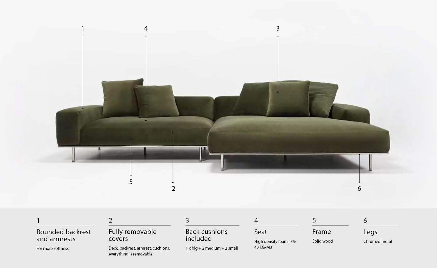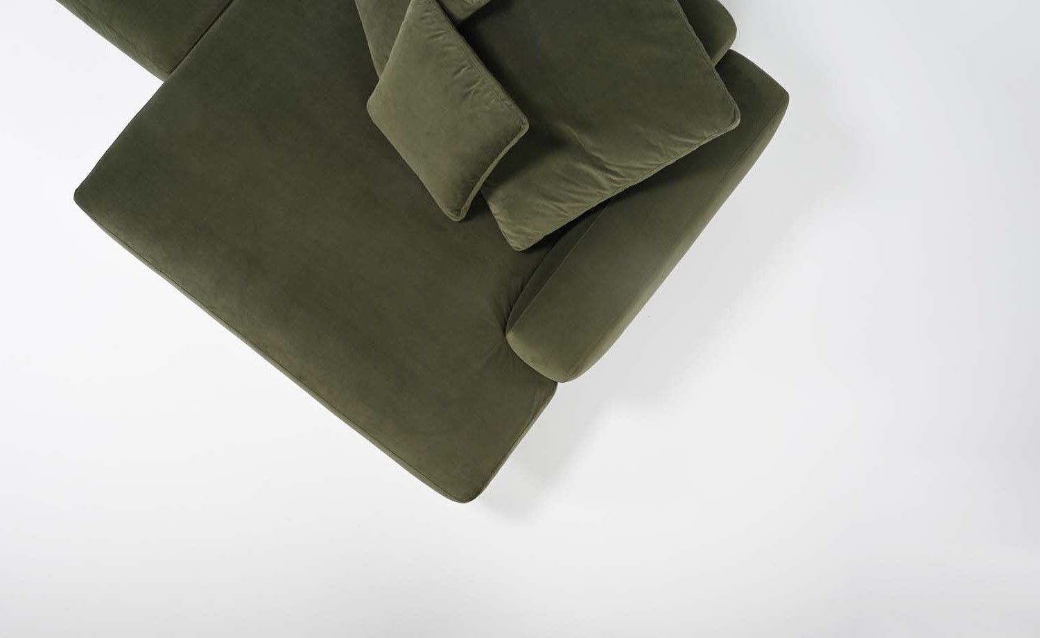 This collection is complemented by a chaise longue with generous volumes and a set of asymmetrically-sized cushions. Designed for those who enjoy unconventional looks and seating positions. Features fully removable slipcovers and is available in all edb fabrics.