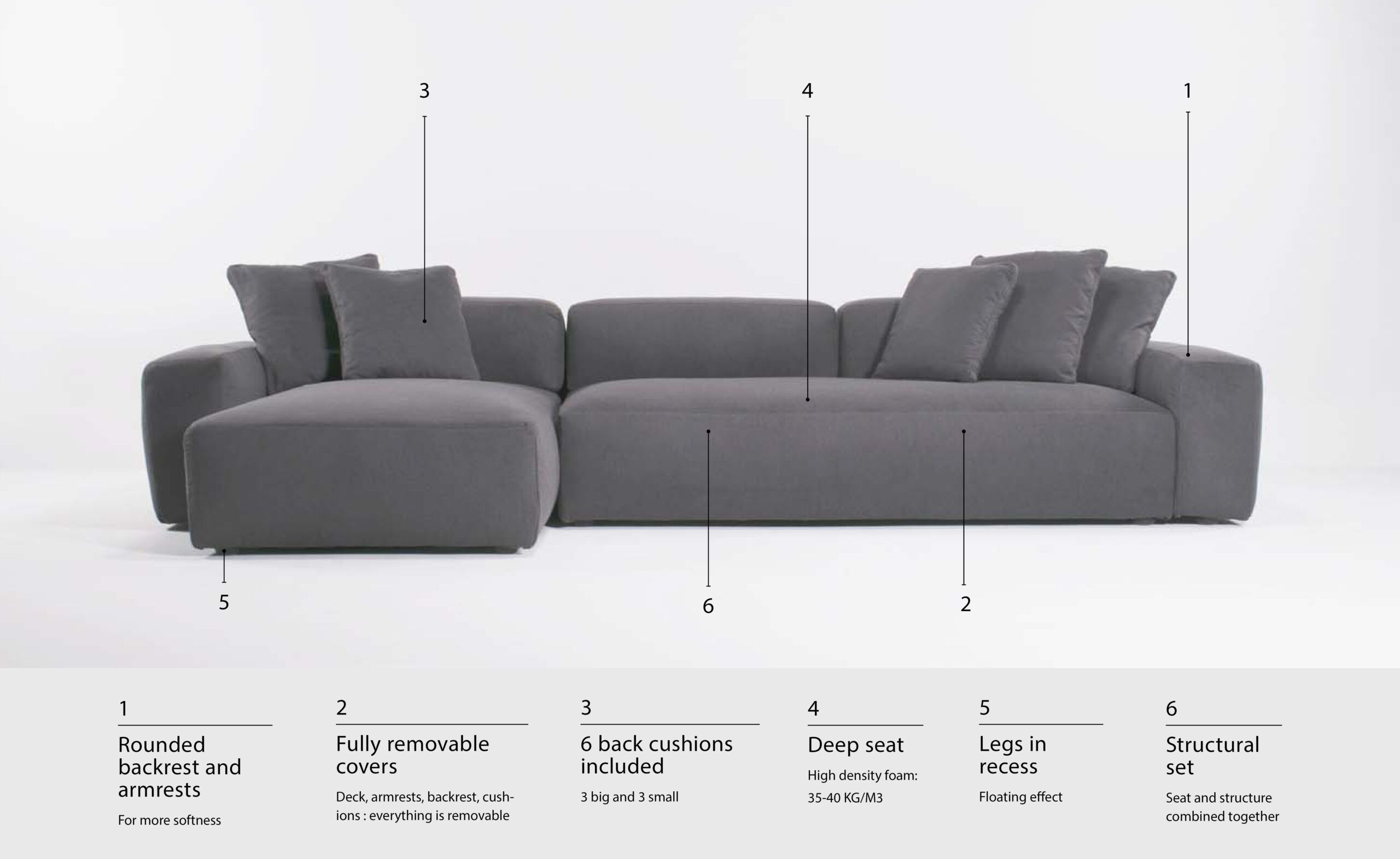 atypical. low to the ground, puffy shapes, and deep seating sum up what the expo sofa is all about. to achieve the rounded and puffed-up silhouette, we completely wrapped the sofa in HIGH DENSITY FOAM. with detachable armrests and backrests as well as fully removable covers, the model is also practical and easy to move around. designed for unconventional seating positions, this sofa is made for those looking for a new type of comfort and ergonomics. find yours by passing by our showroom. goodbye sitting straight!