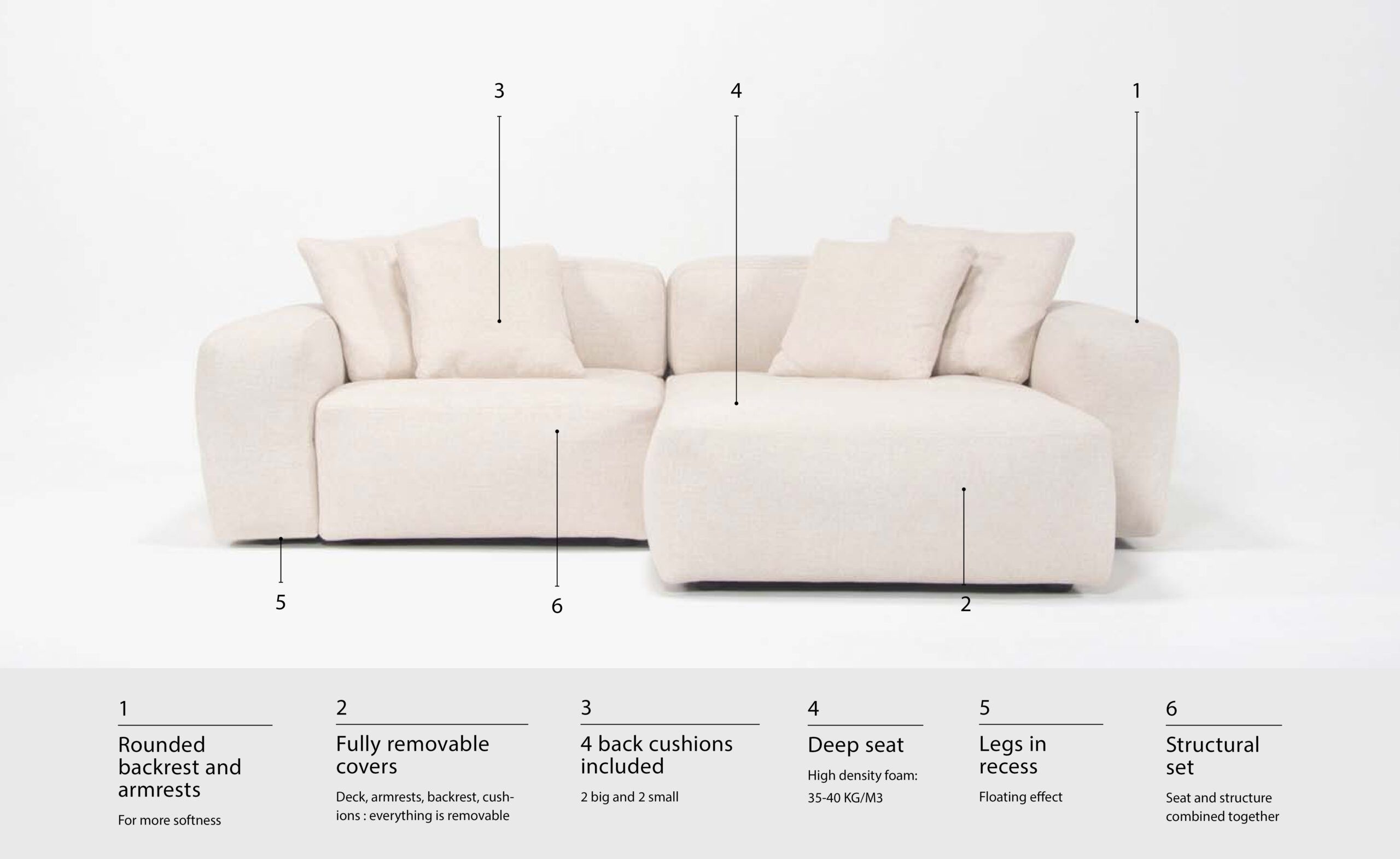 atypical. low to the ground, puffy shapes, and deep seating sum up what the expo sofa is all about. to achieve the rounded and puffed-up silhouette, we completely wrapped the sofa in HIGH DENSITY FOAM. with detachable armrests and backrests as well as fully removable covers, the model is also practical and easy to move around. designed for unconventional seating positions, this sofa is made for those looking for a new type of comfort and ergonomics. find yours by passing by our showroom. goodbye sitting straight!