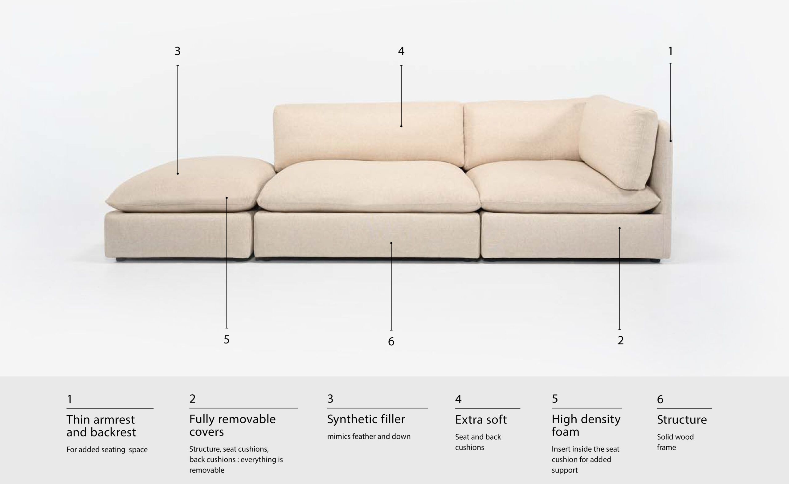 Cozy. Inviting. Puffy. The Puff sofa is edb’s new king of softness. With its generous cushions and trillium filling, this collection offers soft yet supportive comfort. With its modular design, it adapts easily to any space, from small two-seater sofas to larger sectional configurations. Its versatility transforms any interior into a cocoon of relaxation. Features fully removable slipcovers and is available in all edb fabrics.