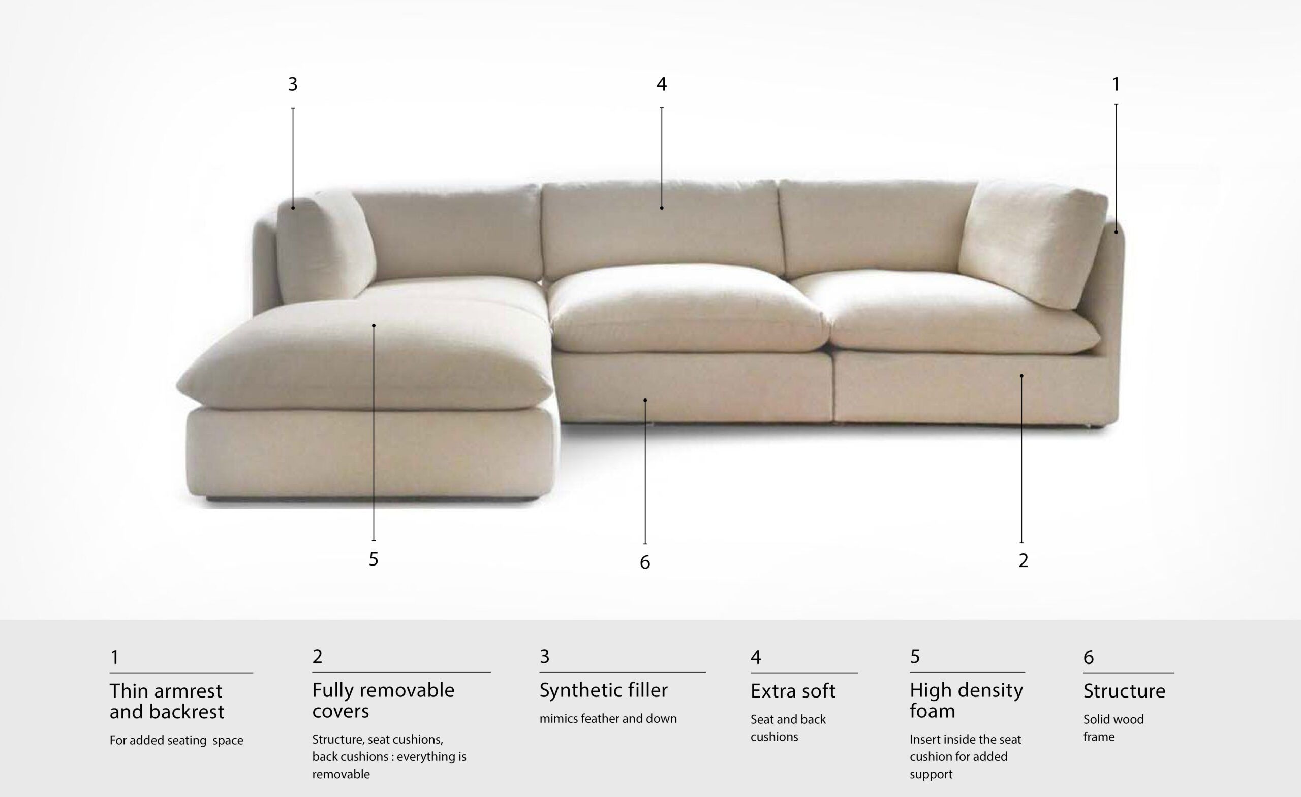 Cozy. Inviting. Puffy. The Puff sofa is edb’s new king of softness. With its generous cushions and trillium filling, this collection offers soft yet supportive comfort. With its modular design, it adapts easily to any space, from small two-seater sofas to larger sectional configurations. Its versatility transforms any interior into a cocoon of relaxation. Features fully removable slipcovers and is available in all edb fabrics.