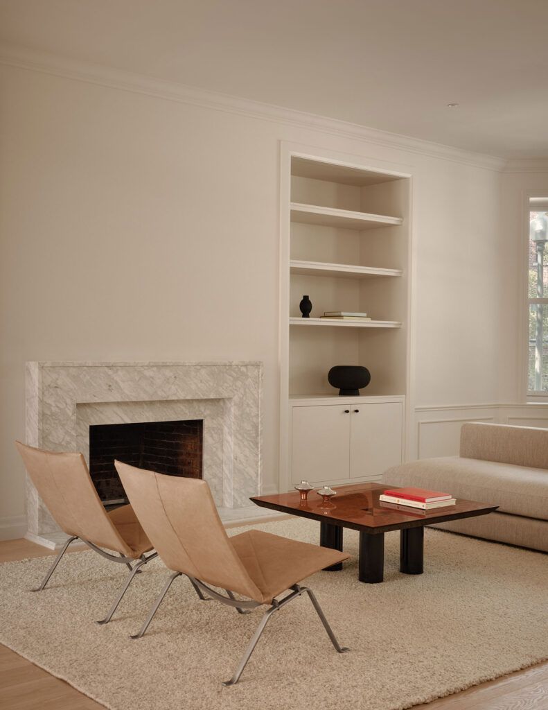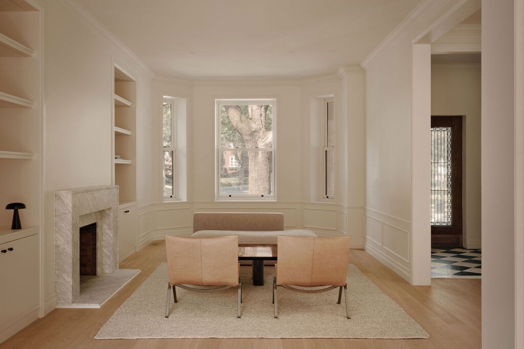 L’intervention s’appuie sur un travail minutieux des détails. De nouvelles moulures ont été conçues afin de recréer une présence d’époque, réaffirmant la continuité entre l’existant et les gestes contemporains. Au salon, deux bibliothèques intégrées de chaque côté du foyer structurent l’espace : elles instaurent une symétrie visuelle apaisante, tout en répondant à un besoin concret de rangement et de fonctionnalité.