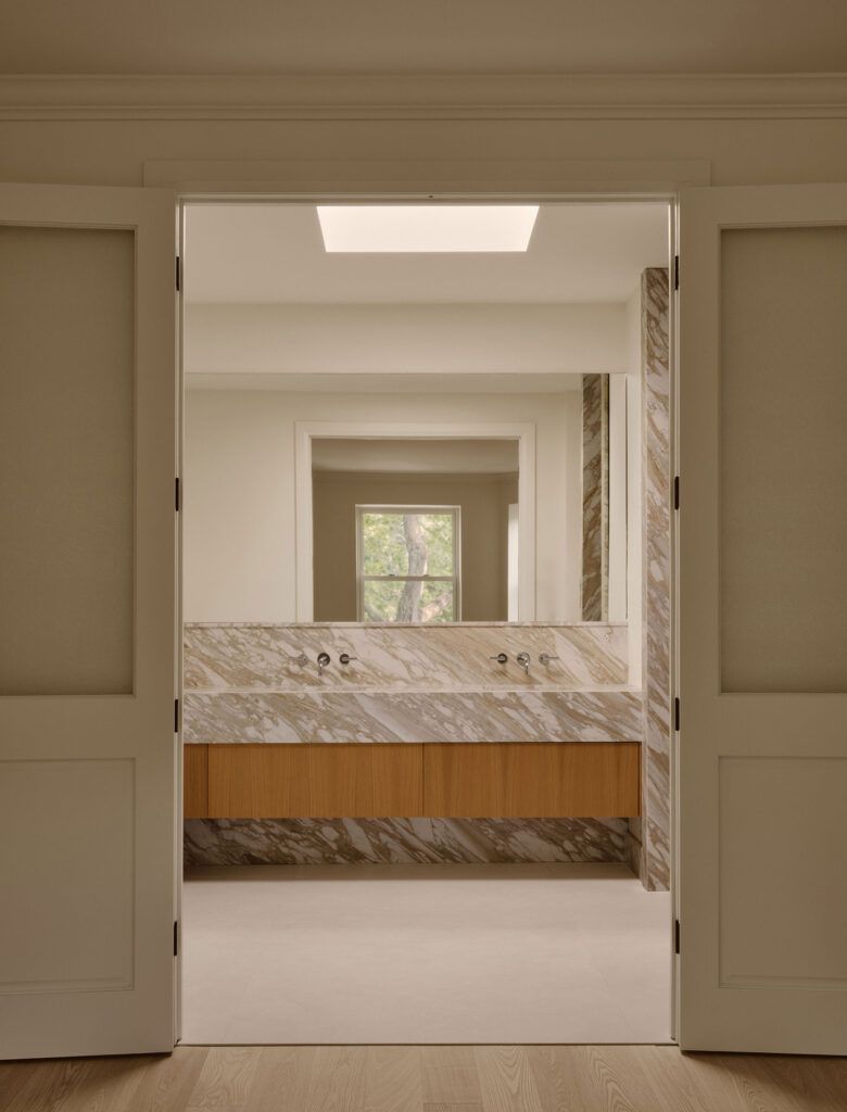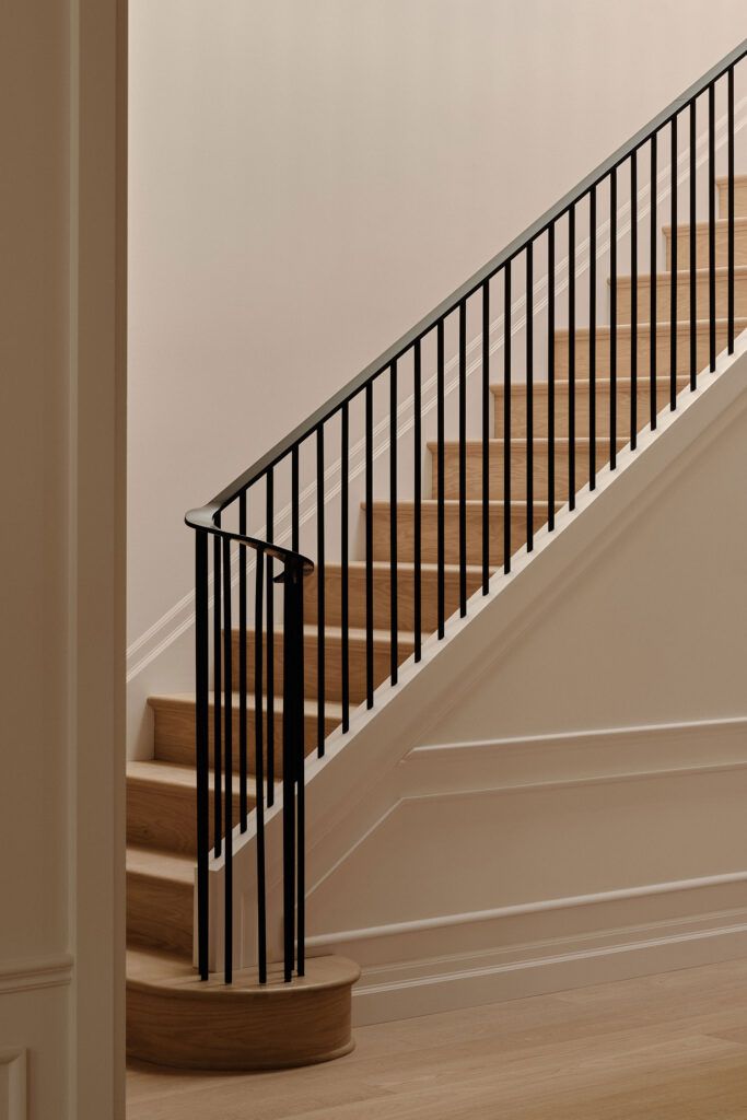 Le marbre, présent dans différents espaces de la maison, agit comme fil conducteur matériel. À cette matérialité classique répond la rampe d’escalier en métal peint noir, dont le dessin évoque le vocabulaire ancien tout en adoptant une lecture résolument contemporaine.