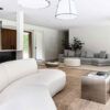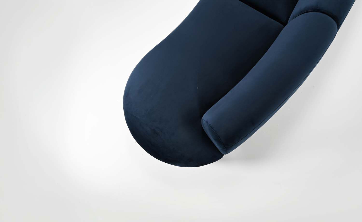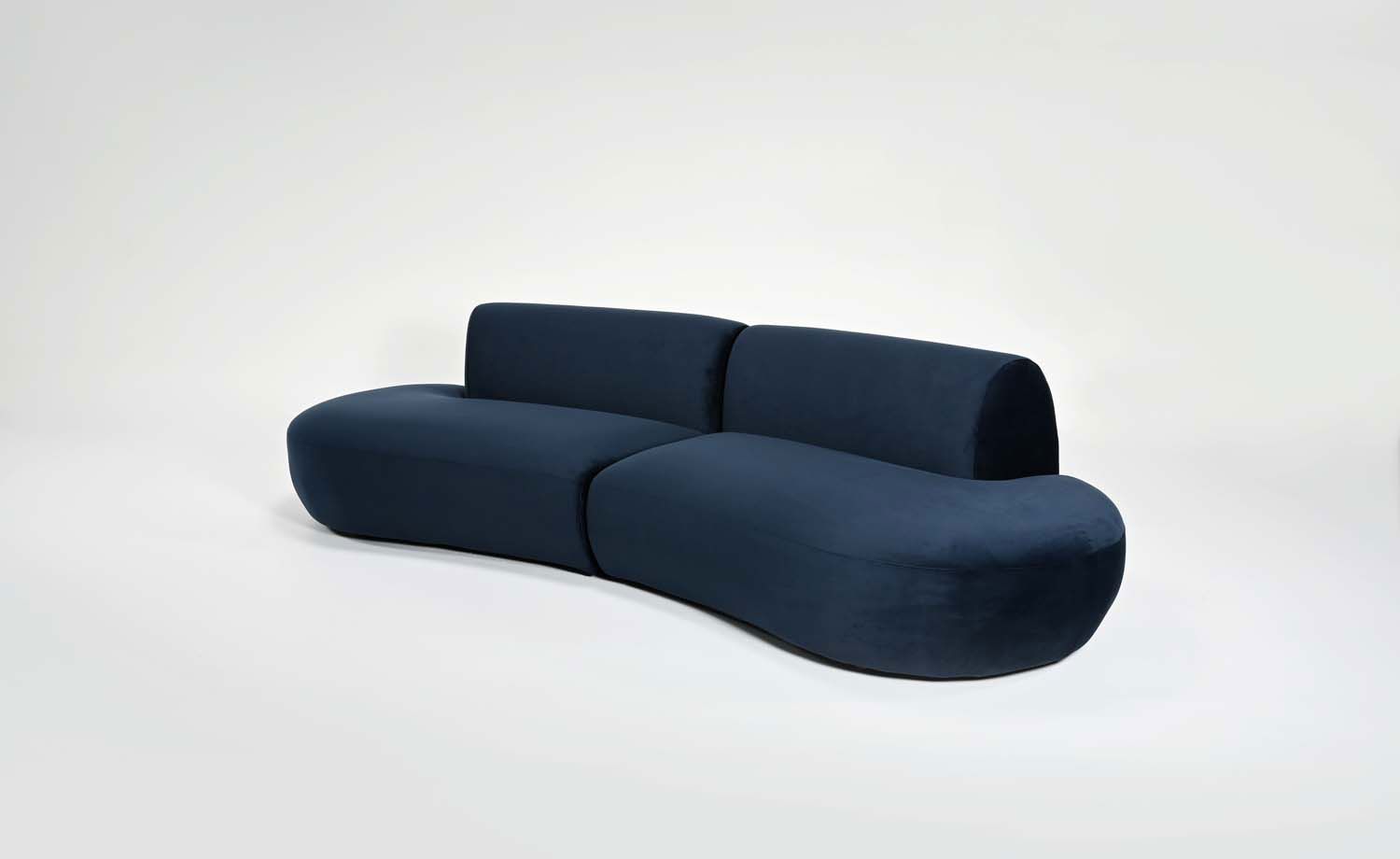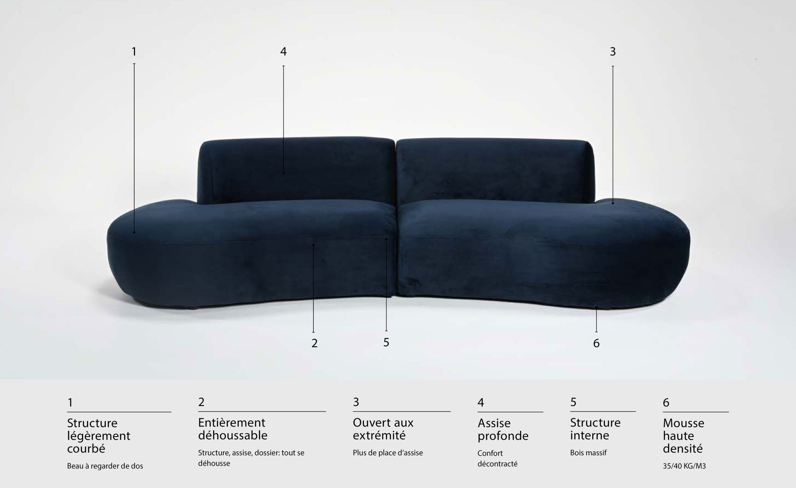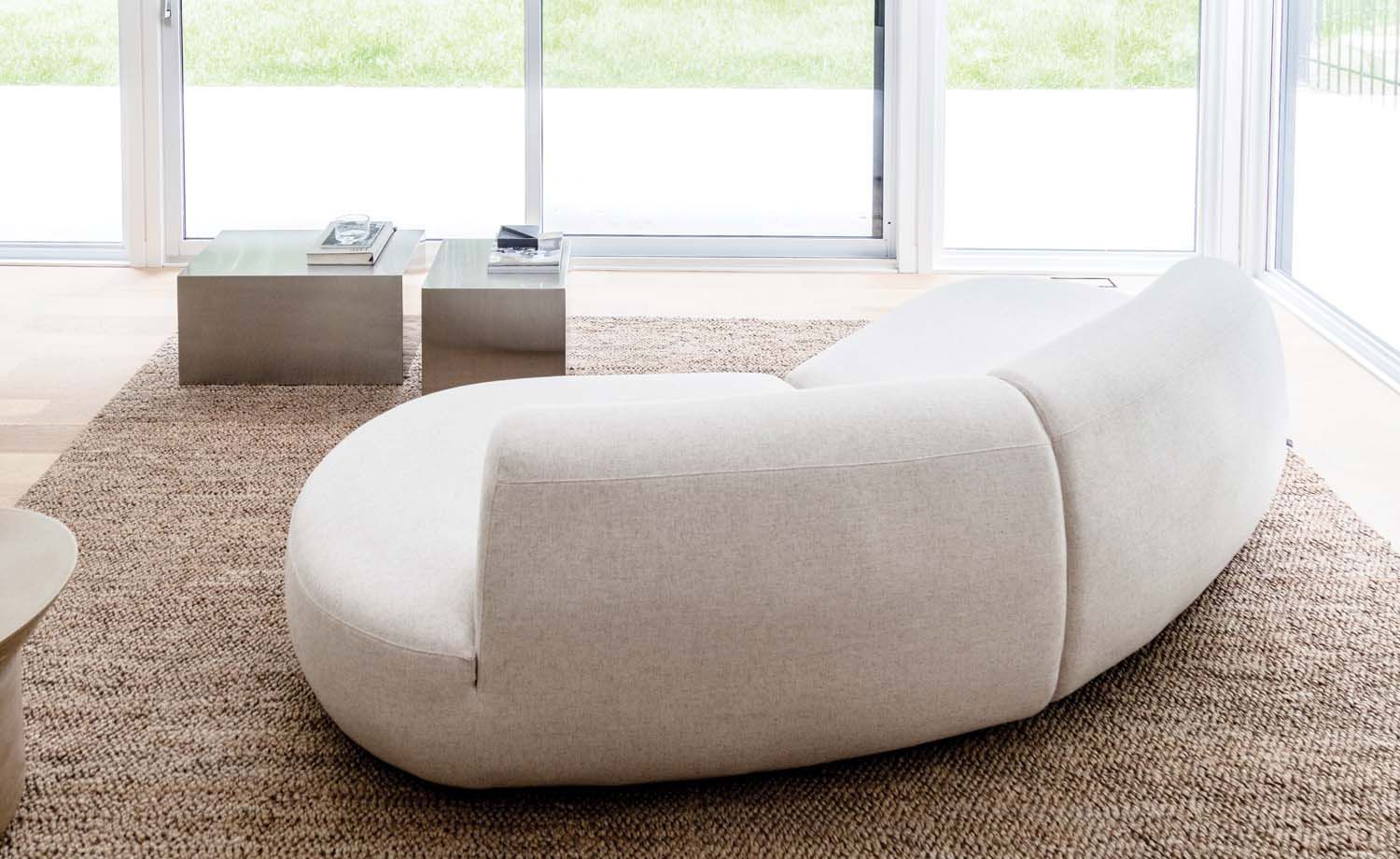 rondeurs dans tous les axes. dossier arrondi, profil bombé, assise profonde. le nouveau canapé beluga d’edb se compose en deux morceaux aux extrémités ouvertes en forme de dôme offrant un dégagement visuel et aéré. avec son allure de croissant, il se décline en deux dimensions : grand format et petit format. présenté ici, il fait 105″ de long. comme tous les canapés edb, il est entièrement déhoussable.