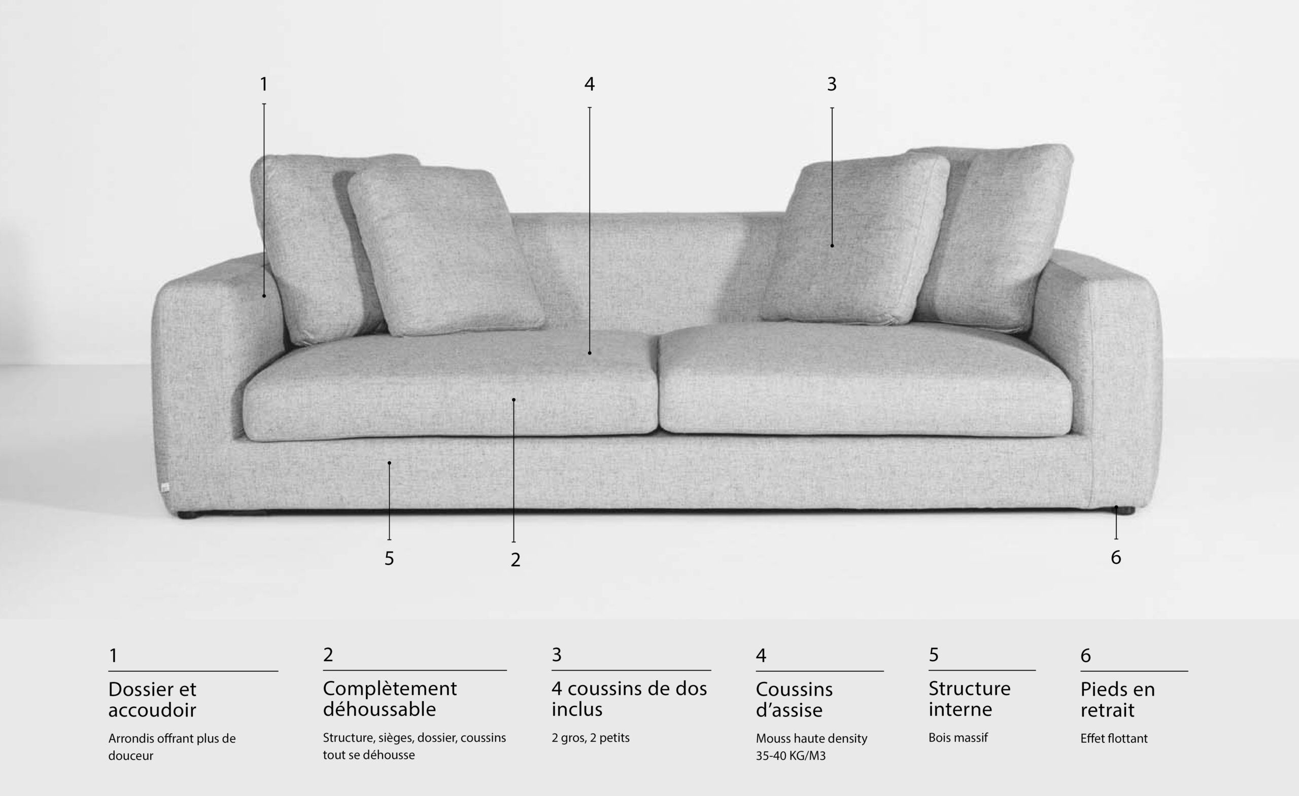 1 an de garantie couvrant les châssis et les coussins de nos canapés contre tout défaut de fabrication et de matériaux.