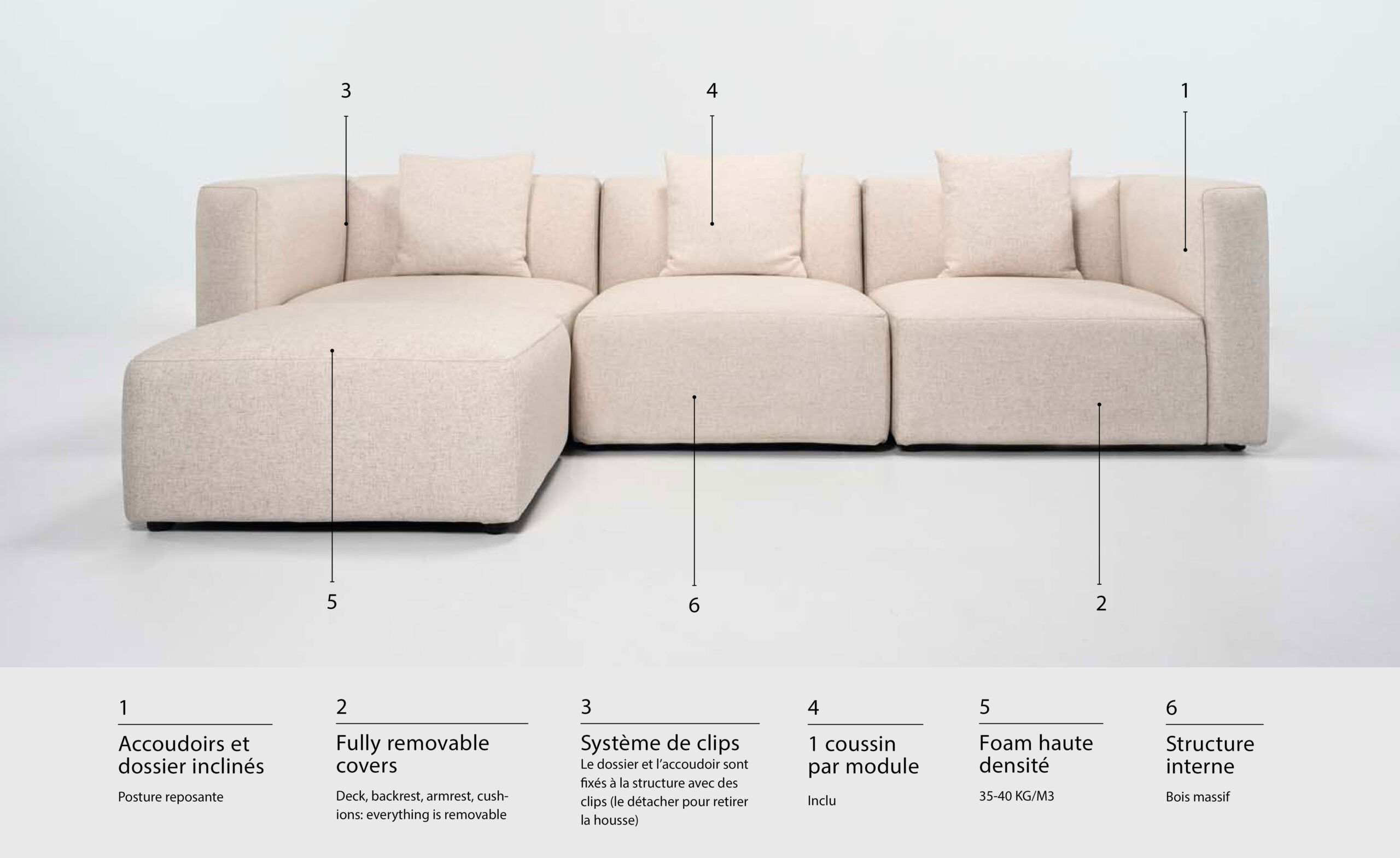 Idéal pour les plus petits espaces, le Section est versatile et modulable à souhait. Son design au sol et ses lignes simples lui confèrent un look classique. L’assise en mousse haute densité lui donne son confort soutenu et rebondissant. Chaque module est équipe d’un coussin de dos pour un supplément de confort et une touche décorative. Entièrement déhoussable et disponible dans tous les tissus edb.