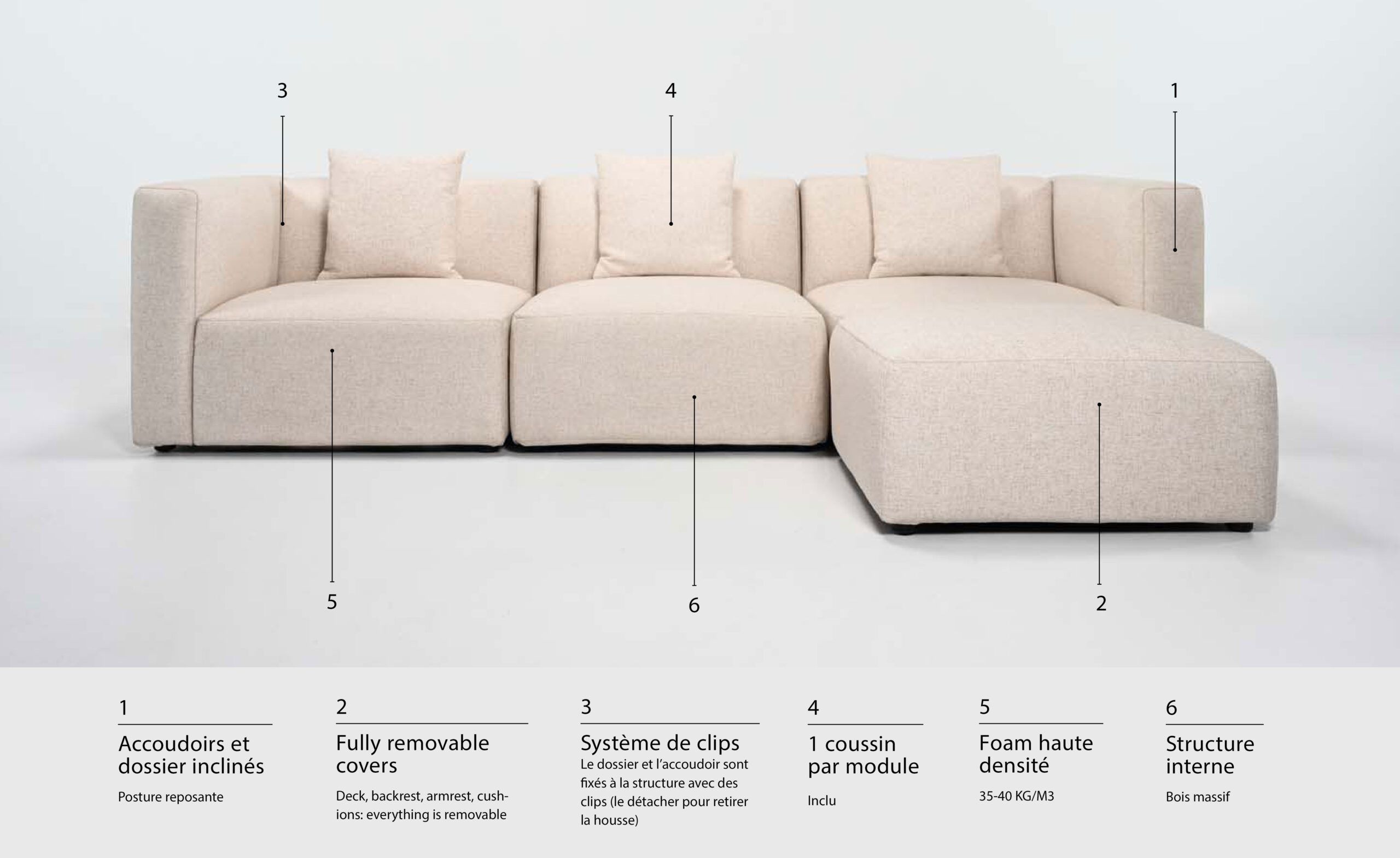 Idéal pour les plus petits espaces, le Section est versatile et modulable à souhait. Son design au sol et ses lignes simples lui confèrent un look classique. L’assise en mousse haute densité lui donne son confort soutenu et rebondissant. Chaque module est équipe d’un coussin de dos pour un supplément de confort et une touche décorative. Entièrement déhoussable et disponible dans tous les tissus edb.